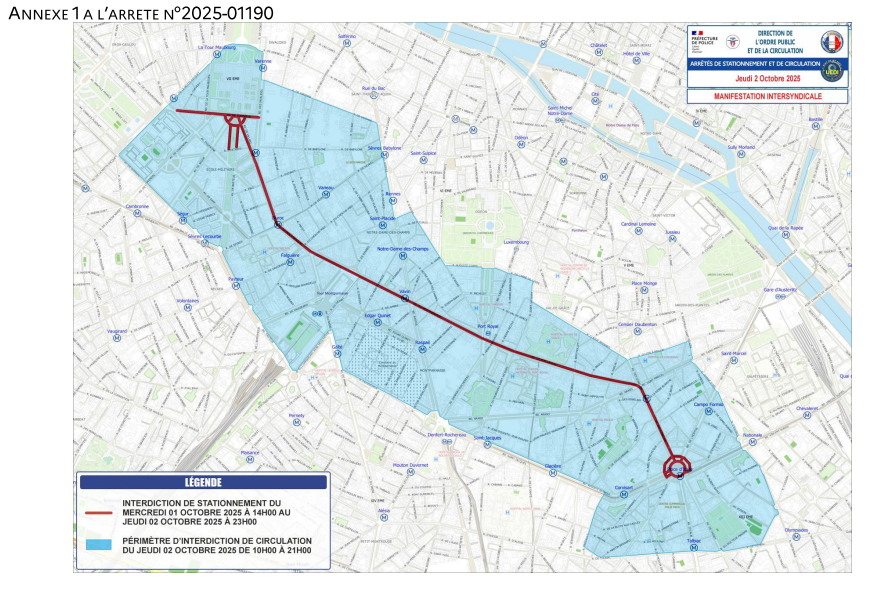La circulation de tout véhicule motorisé est interdite le jeudi 2 octobre 2025, de 10 heures à 21 heures, à l'intérieur du périmètre délimité par les voies suivantes du 7e :