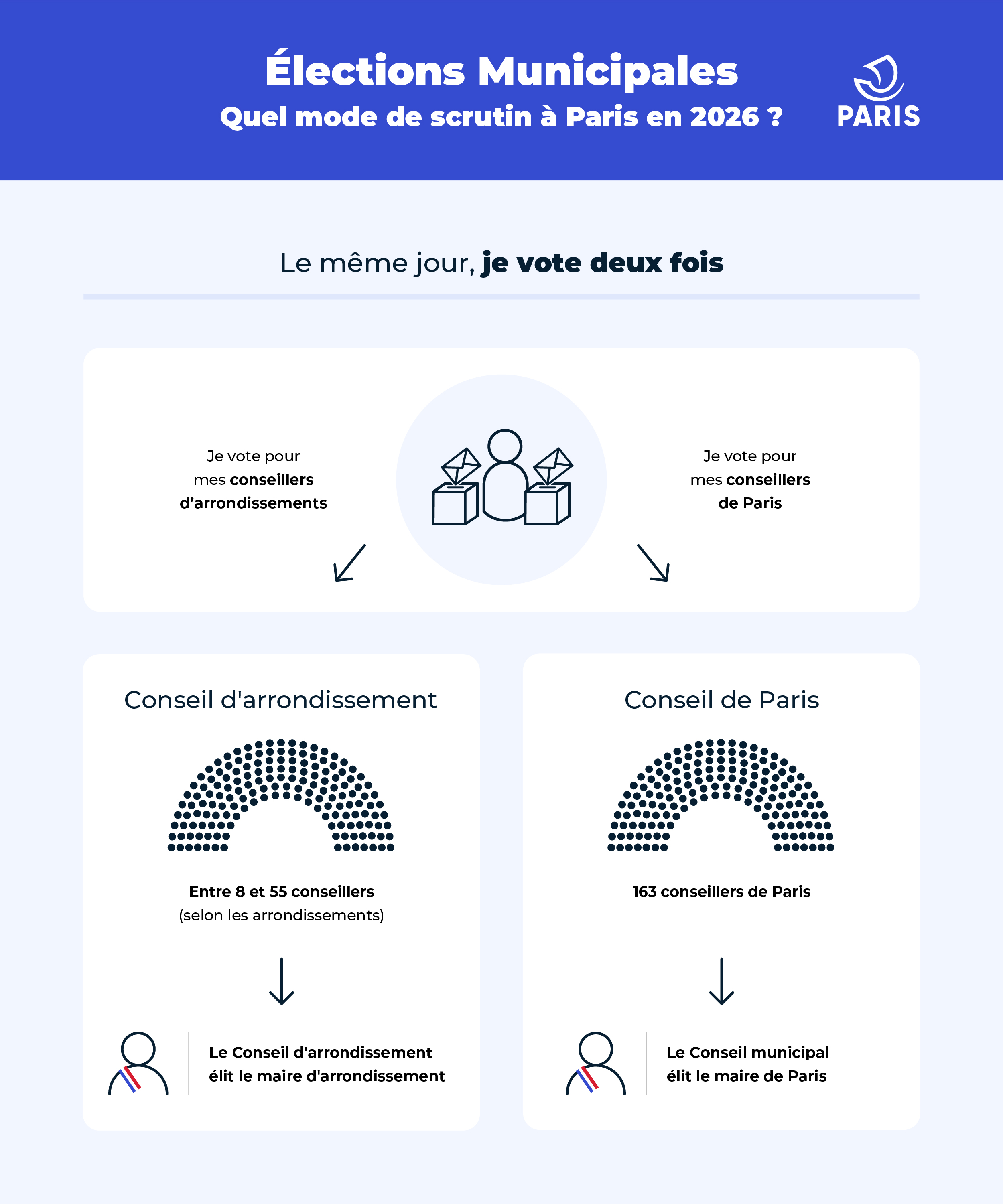 La loi du 11 août 2025 modifie le mode de scrutin, notamment en instaurant deux votes distincts : l’un pour élire les conseillers d’arrondissement, l’autre pour élire les conseillers de Paris.
