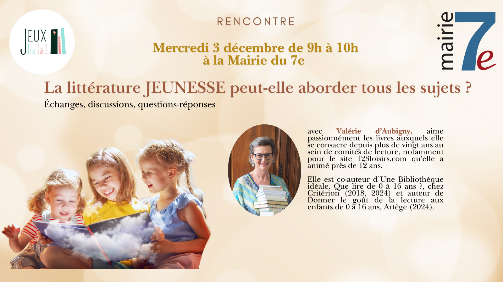 La Mairie du 7e organise la 16e édition de son salon du livre de la Jeunesse, le mercredi 3 décembre 2025 de 14h30 à 18h, en partenariat avec la librairie Jeux Lis Là.